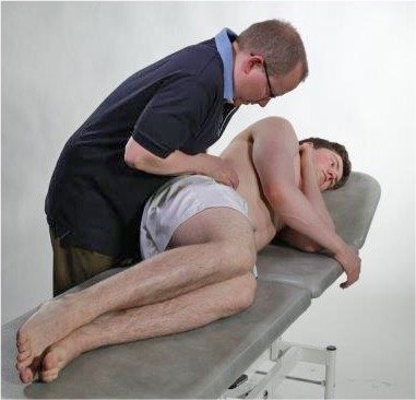 - Pasient i ryggleie, kryssede hender på spina iliaca anterior superior