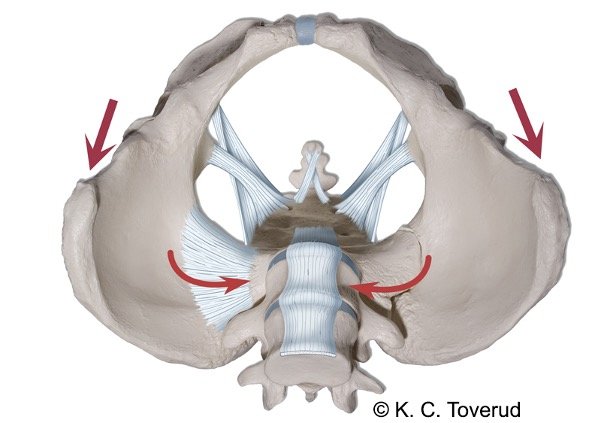 - Komprimerer iliosacralleddet baktil, åpner leddet fortil