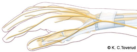 - Nerveskade forårsakes av traume, venepunksjon, kirurgi eller etter nerveskade i forbindelse med injeksjon for de Quervain tenosynovitt.