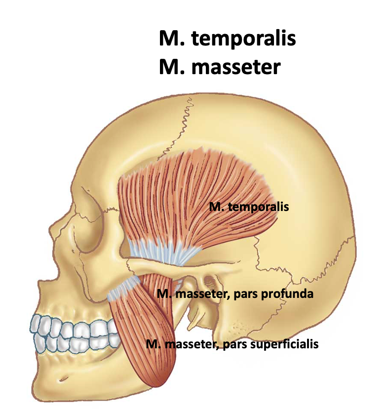 - M. temporalis: Viktig for heving og retraksjon av underkjeven.