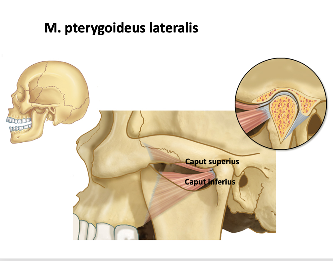 - M. pterygoideus medialis: Hever og sidedevierer (laterotrusjon).
