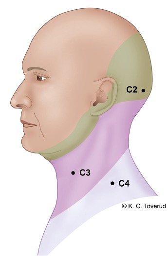 C2 nerverotaffeksjon er sjelden, men kan sees ved traume mot øvre cervikalcolumna, tumor eller karanomali som kan medføre trykk mot C2 nerverot