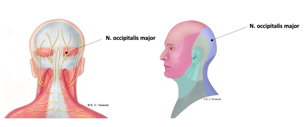 - Pasienten klager over konstant ubehag/press suboccipitalt, episodevise oppleves intense smerteutstrålinger til bakhodet i n. occipitalis major sitt sensoriske område