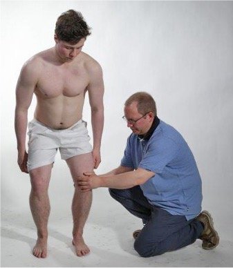 Medial leddbåndskade: Palper etter ømhet i leddspalten på strakt kne og med 90 grader fleksjon. Dersom smerter i leddspalten på både strakt og flektert kne mistenk meniskskade.