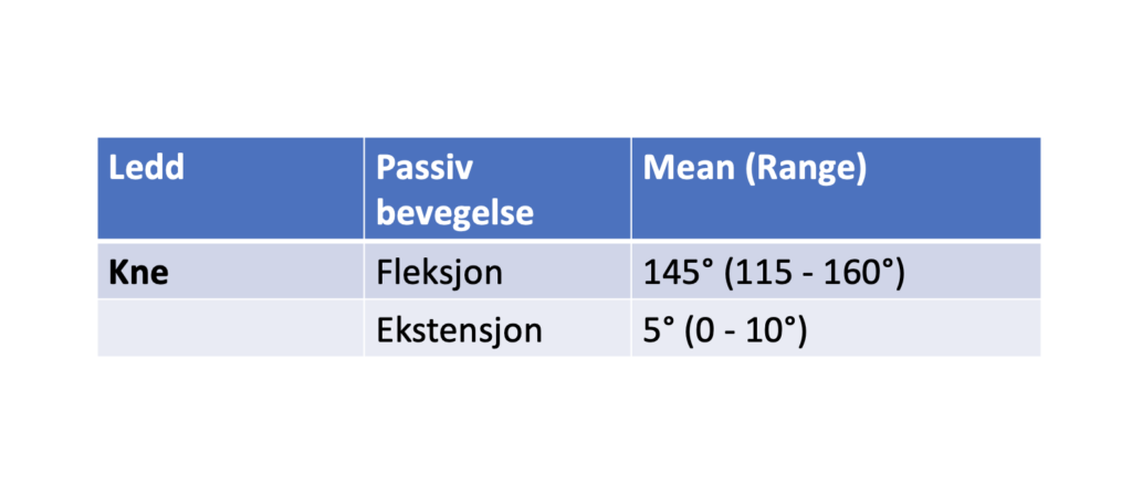 - Normverdier: fleksjon 145°, ekstensjon 5°, innadrotasjon 22°, utadrotasjon 30°.