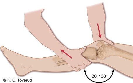 - Foten holdes i henholdsvis nøytral stilling (vanligst testposisjon som gir størst grad av fremre instabilitet), 15° utadrotasjon (fremre + medial instabilitet) og 30° innadrotasjon (fremre + lateral instabilitet).