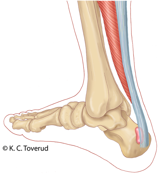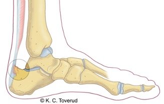 - Bursa retrocalcanea ligger under akillessenen ned mot det distale festet på calcaneus. Smerter, hevelse og fluktuasjon når bursaen palperes. Diagnostiseres med UL.