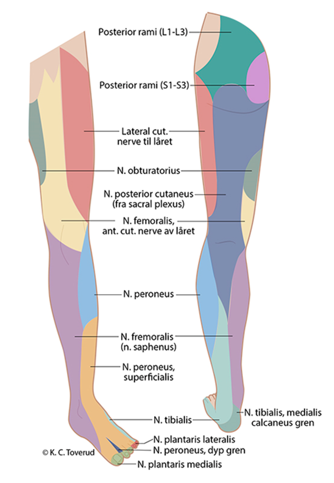 • Nedenfor caput fibulae deler nerven seg i en dyp gren, N. fibularis (peroneus) profundus og i en overfladisk gren N. fibularis (peroneus) superficialis