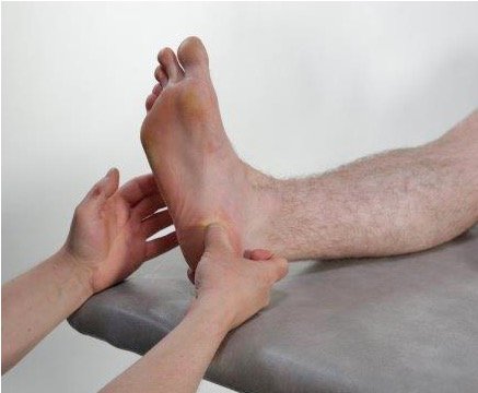 - Dorsalflekter ankelen maksimalt og dorsalflekter 1. tå så plantarisfascien spennes opp. Palperes medialt fra bakre 3. del inn mot calcaneus. Registrer smerte i festet på calcaneus.