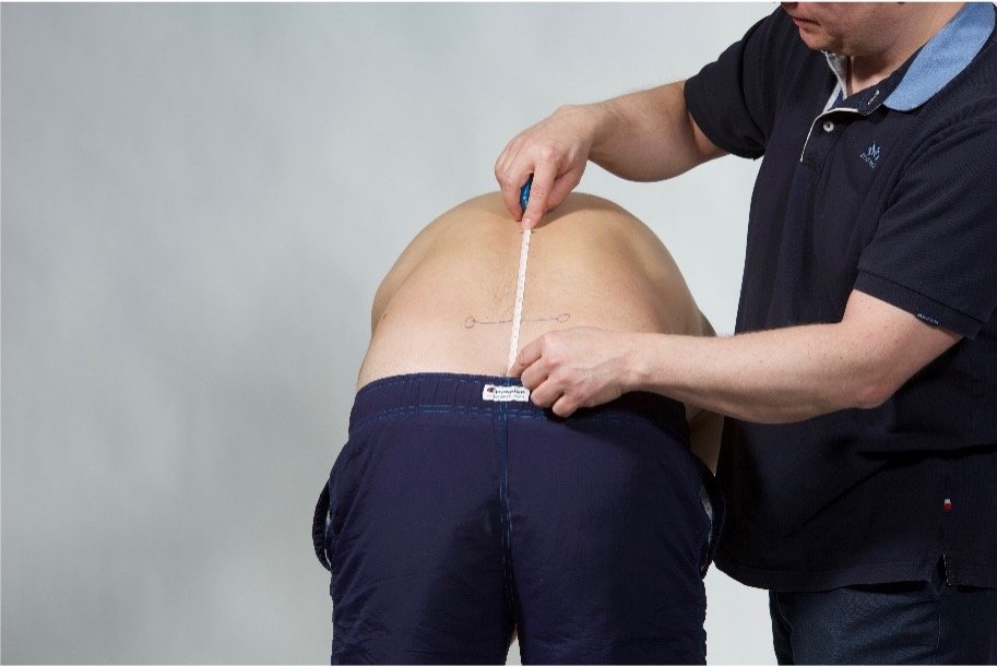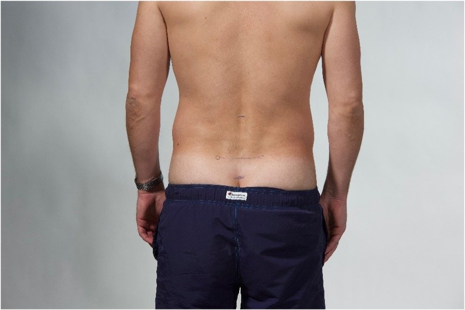 - Markerer over «smilehullene», spina iliaca posterior superior (SIPS)