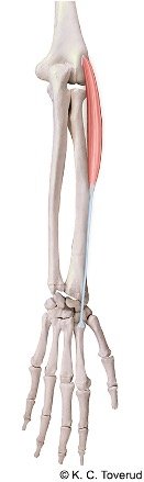 - Lateral epikondyl: Ekstensorfeste → tennisalbue.