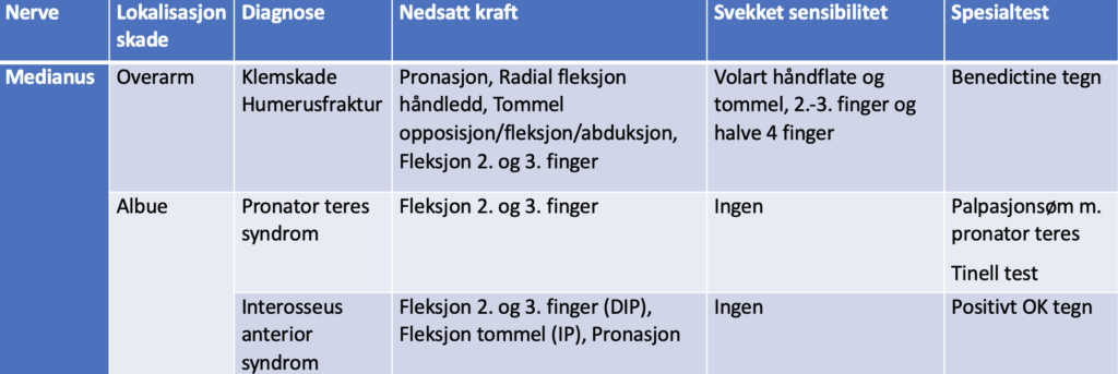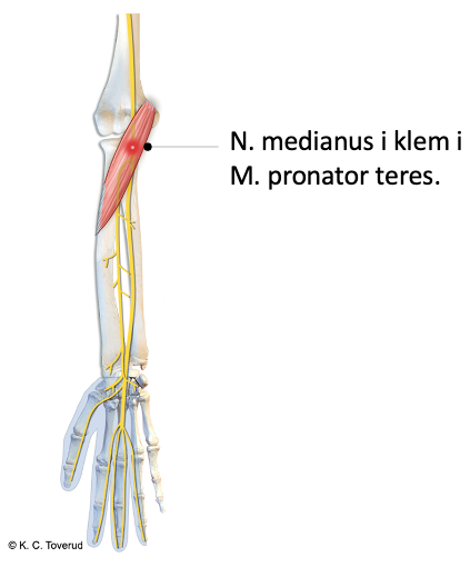 - Ømhet ved palpasjon over M. pronator teres 4 cm fra mediale humerusepikondyl, gir prikkinger og parestesier i medianusområdet ila 30 sekunder kompresjon