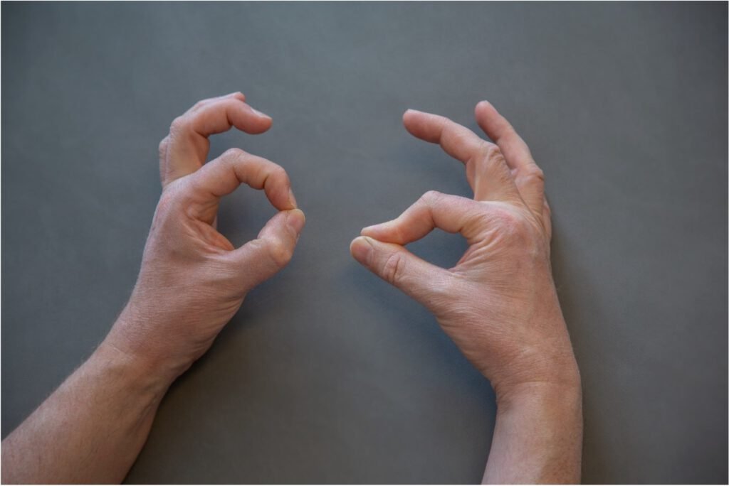 - Positivt OK tegn, dvs at distale phalanx i pekefinger og tommel ikke kan flektere og lage en O