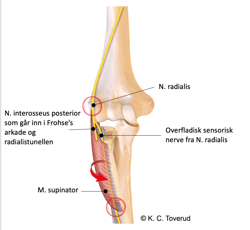 N. interosseus posterior i 60-70% av tilfellene i klem i Frohse’s arkade (øvre kant av M. supinator). Sjeldnere i radialistunellen som går fra øvre kant av M. supinator og 5 cm distalt