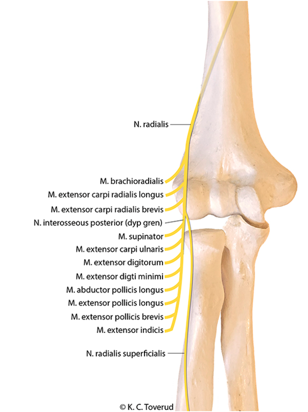 - Normal kraft ved ekstensjon i radial retning, innervasjonen til M. extensor carpi radialis longus og M. extensor carpi radialis brevis avgår før Frohse’s kanal