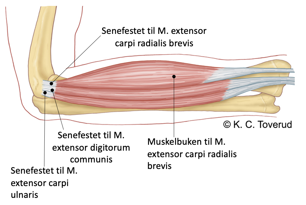 - Smerten kan bre seg opp til overarmen og ned i underarmen i tillegg til punktsmerten ved albuen (radiale humerusepikondyl)
