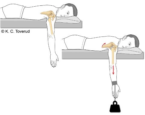 Hengende arm for lukket reponering av fremre skulderluksasjon. Pasienten ligger på magen med armen hengende over kanten. Drag i armen eller bruk av vekter. Behandleren skyver nedre hjørne av skulderbladet mot midtlinjen og gjør samtidig rotasjon og traksjon av den hengende armen