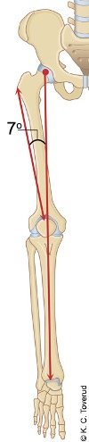 - Femur må tippe 7° ut fra knærne for at den mekaniske aksen skal gå gjennom caput femoris