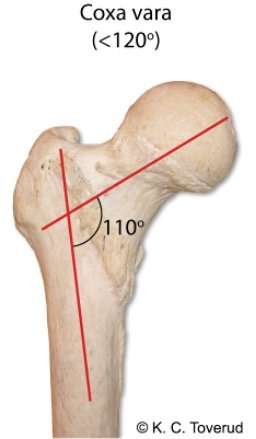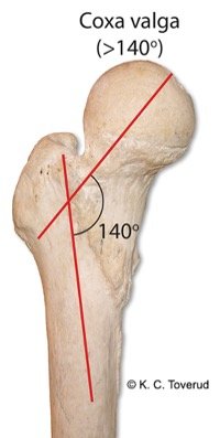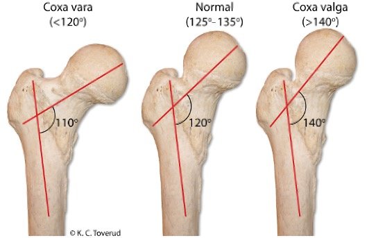 Vinkel mellom lårhalsen og lårbensskaftet, collum diafyse vinkelen, er normalt 125-135°