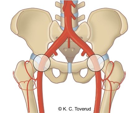 - A. femoralis, trokanter major (bursa, glutealsener).