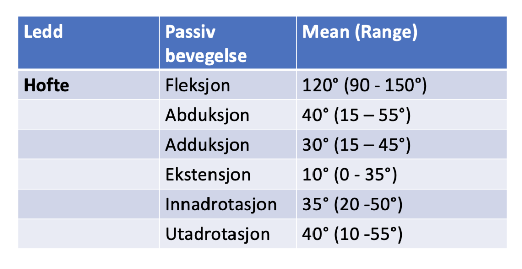 - Normverdier: fleksjon 120°, ekstensjon 10°, abduksjon 40°, adduksjon 30°, innadrotasjon 35°, utadrotasjon 40°.